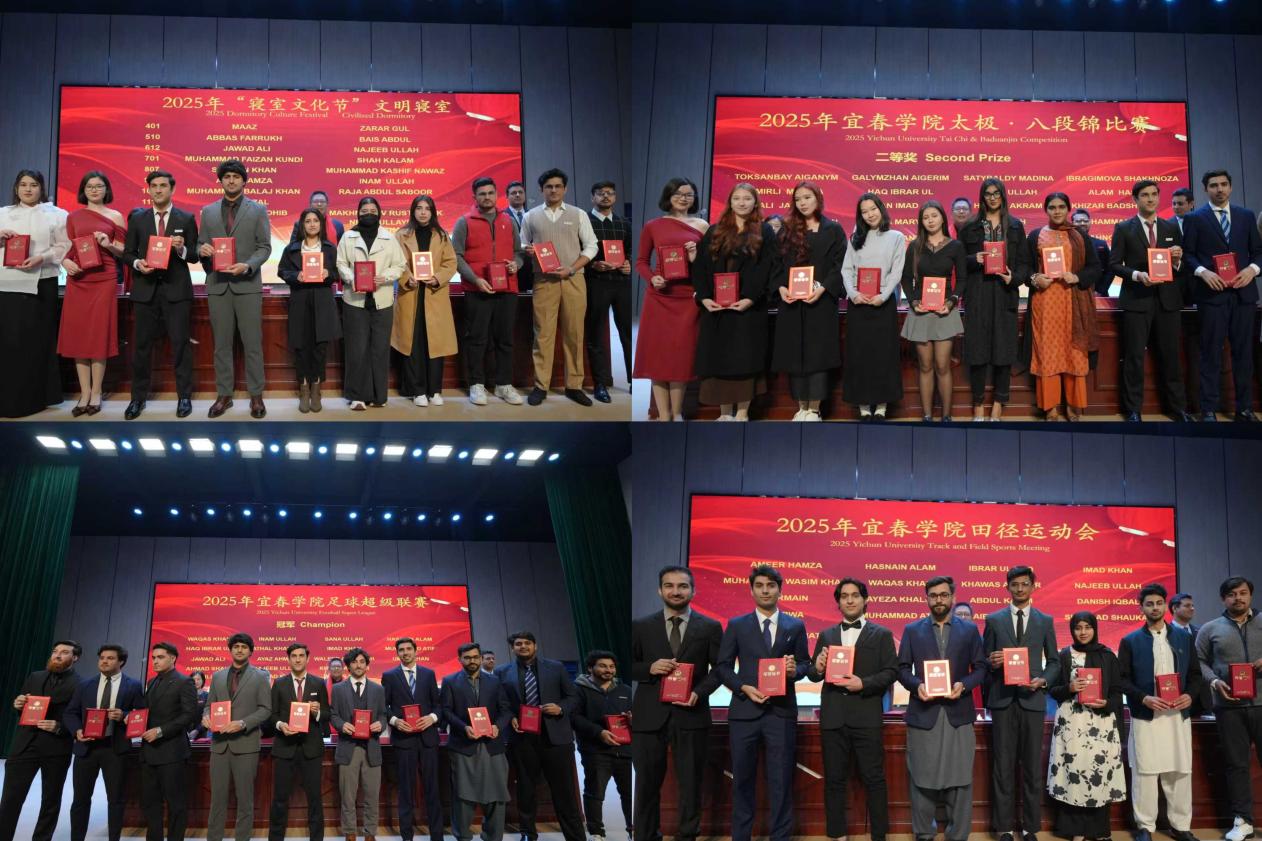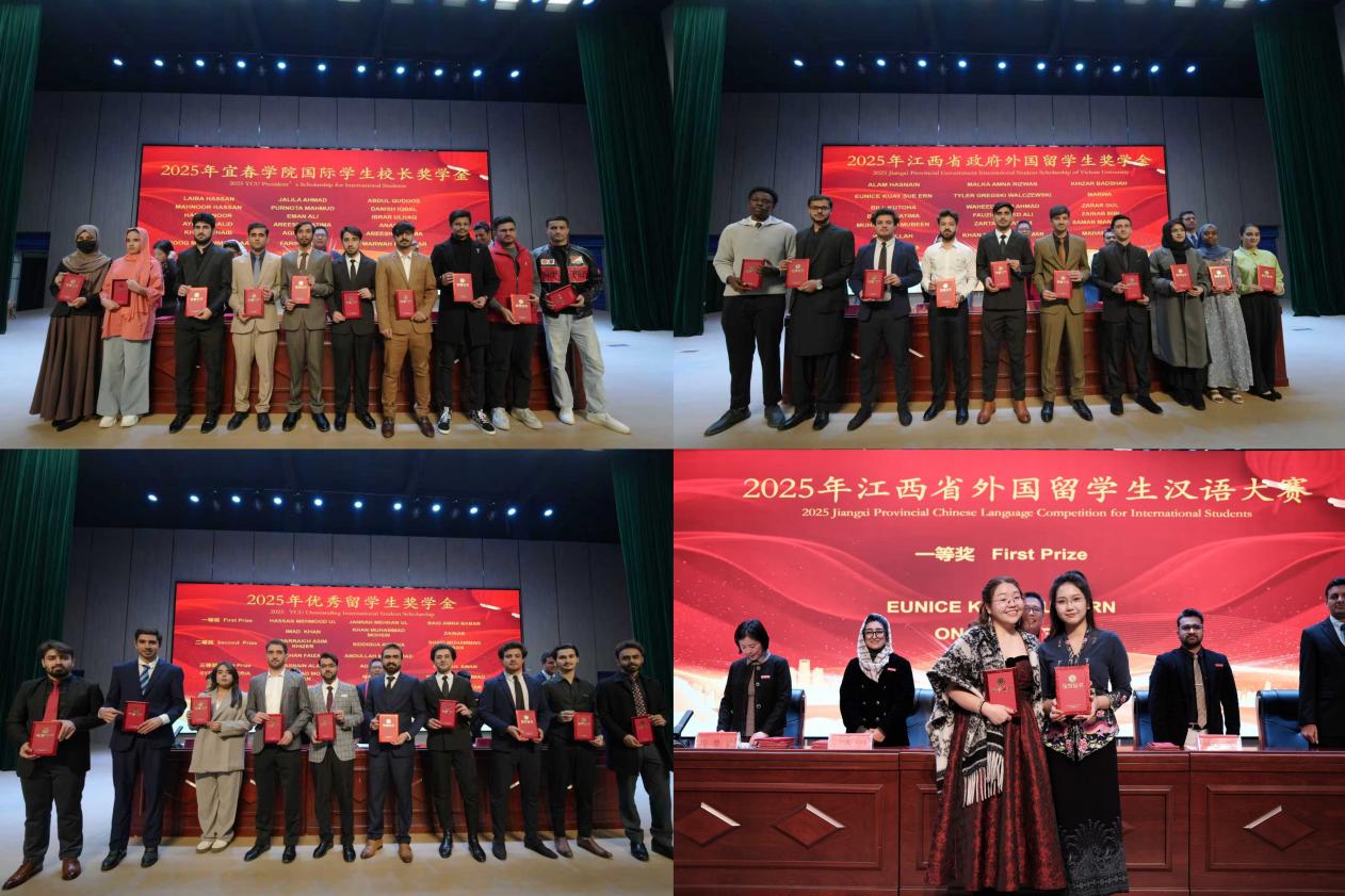 在表彰环节,学院对2023至2025年度在各类活动中表现突出的留学生予以集中表彰,奖项涵盖农耕健身大赛、运动会、文明寝室、汉语大赛及江西省政府外国留学生奖学金、宜春学院优秀留学生奖学金、校长奖学金等十余个奖项。获奖学生依次上台领取证书,接受全场师生的热烈祝贺与崇高敬意。