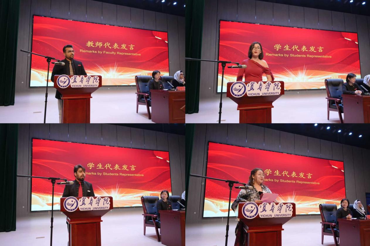 学生代表发言则展现了多元文化背景下的成长轨迹。2021级巴基斯坦留学生马龙讲述了跨文化适应与专业学习的难忘历程;来自哈萨克斯坦的交换生爱涵回忆了从机场接机到文化体验所感受到的温暖;2024级马来西亚留学生郭淑欣则讲述了语言学习与参与文化活动的收获与喜悦。