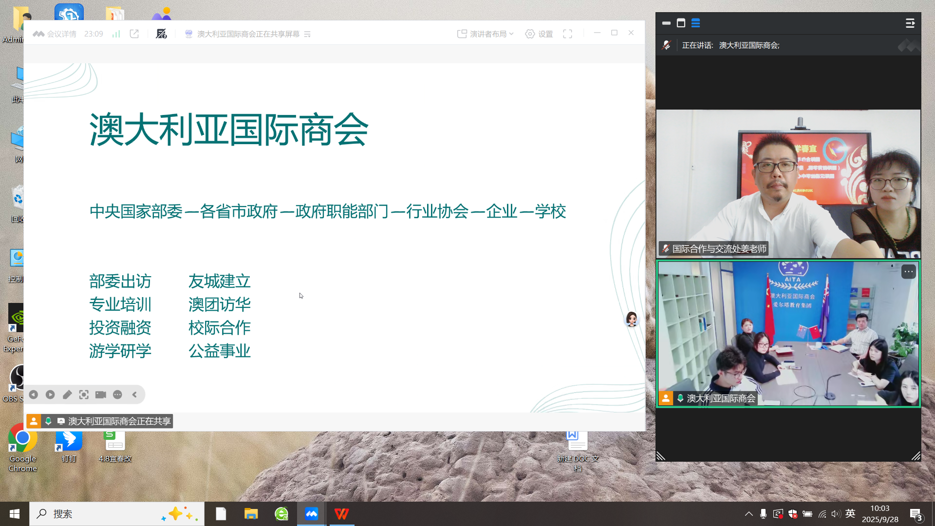 2025年9月28日上午,我校在厚德校区国际合作与交流处会议室与澳大利亚国际商会举行视频会议。我校国际合作与交流处处长赵阳、合作交流科副科长姜璇与澳大利亚国际商会会长麦克果、国际交流部部长Lucy王等参加了会议。