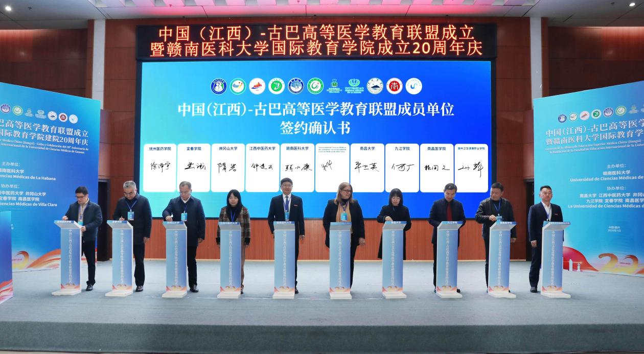 会上,赣南医科大学作为联盟中方理事长单位和牵头高校,南昌大学、江西中医药大学、井冈山大学、宜春学院、南昌医学院、抚州医药学院、九江学院、赣南卫生健康职业学院等单位作为第一批联盟单位进行了签约仪式。